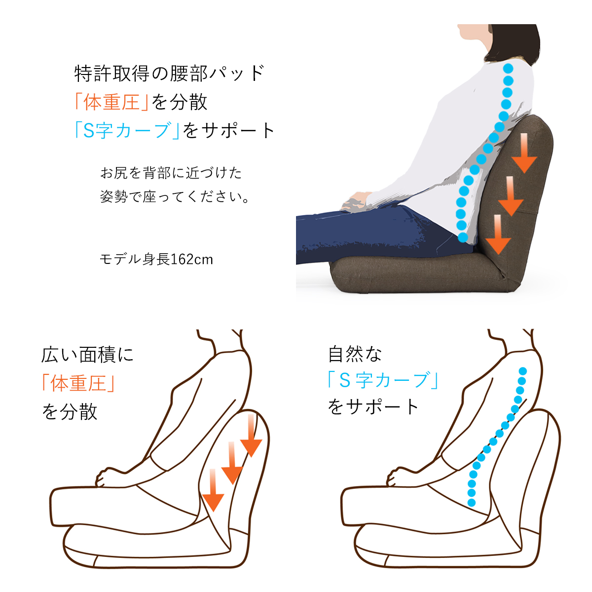 ※本品はお尻を背もたれに近づけた、深く座った姿勢でご使用ください。