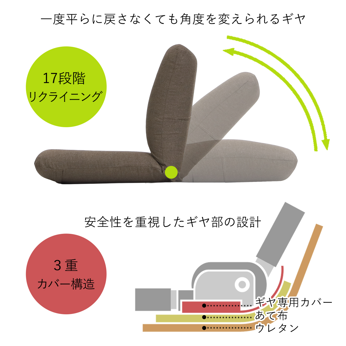 その場合は、座椅子を平らな状態にして側地カバーを整えてからご使用ください。
