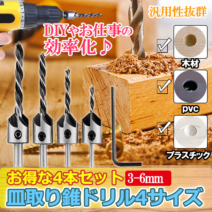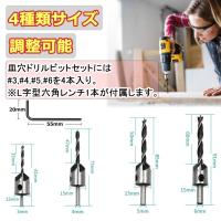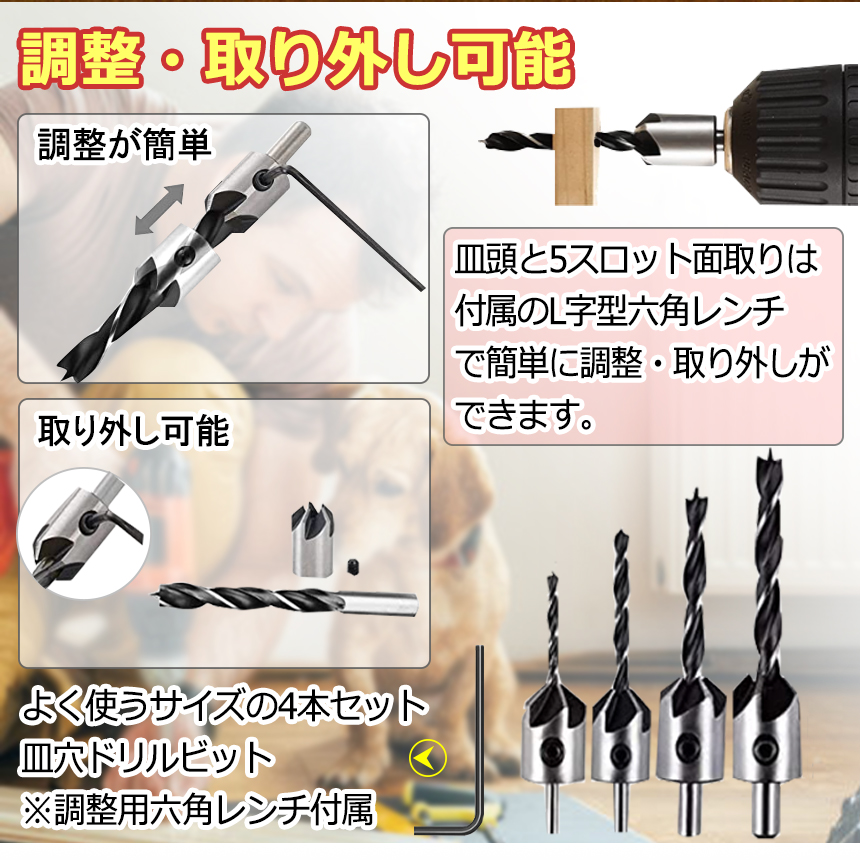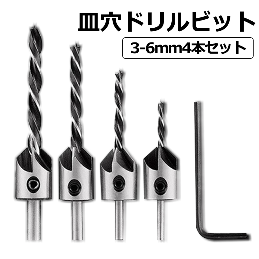 作業に便利な皿穴ドリルビットの4本セットで取付用六角レンチ付属!