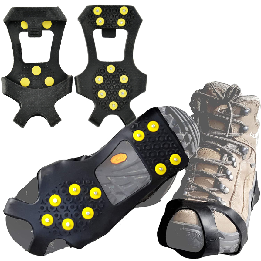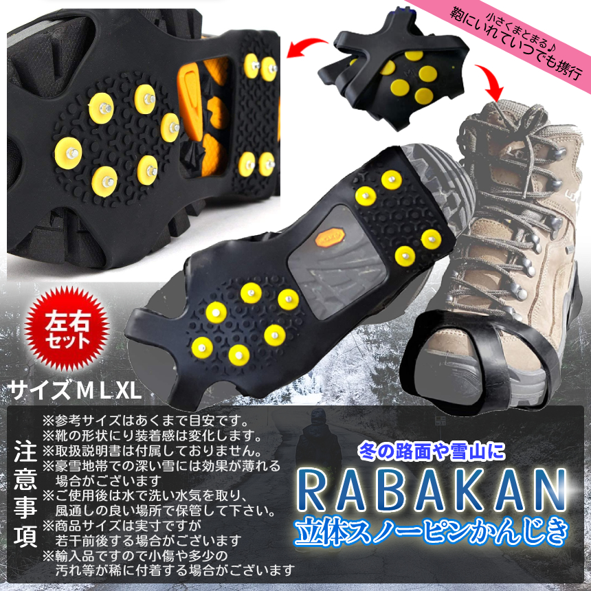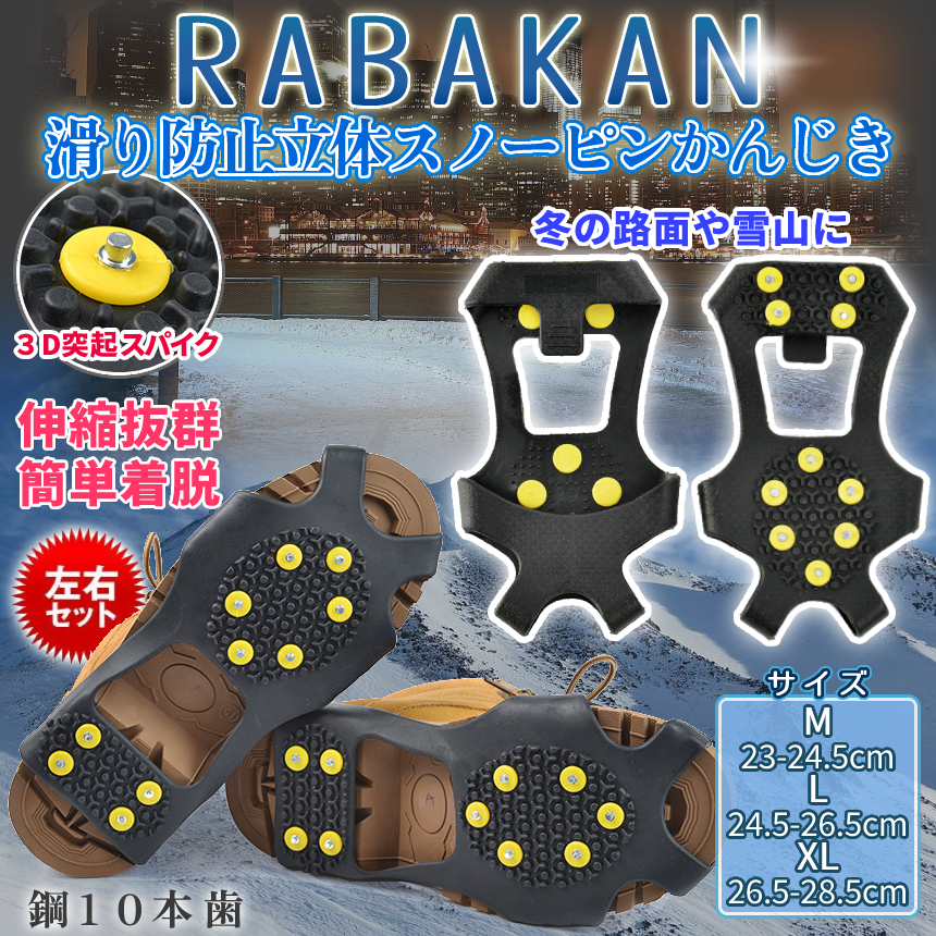 靴 雪道 滑り止め ラバー かんじき スノー スパイク シュー 24.5cm - 28.5cm 10本刃 トレッキング 男女 兼用 ワンタッチ 雪 冬 黒 スニーカー 滑り防止 RABAKAN