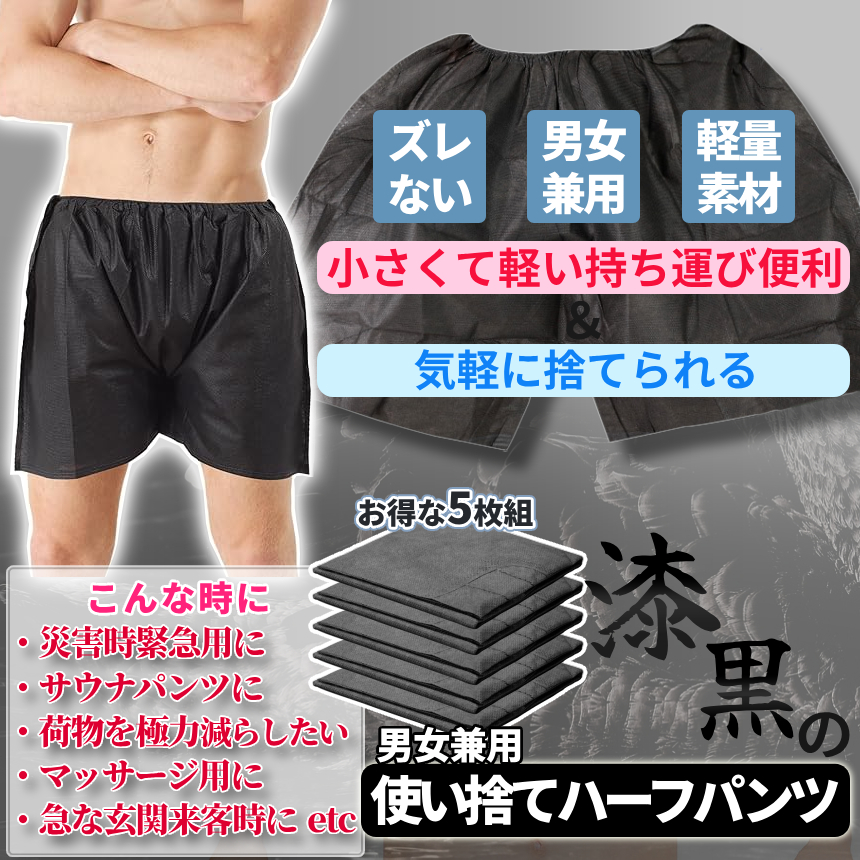 パッケージ内容:使い捨て半パンツ黒×5枚