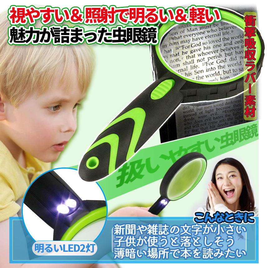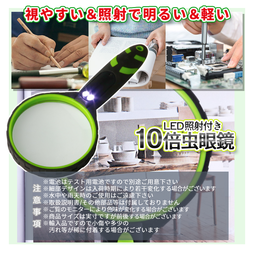 照明付き 虫眼鏡 10倍 光学ガラス 拡大鏡 ルーペ LEDライト付き 広角 軽量 疲れない 手持ち 虫メガネ ラバー 耐衝撃素材 老眼 観察 精密作業 読書 雑誌 10MSMG