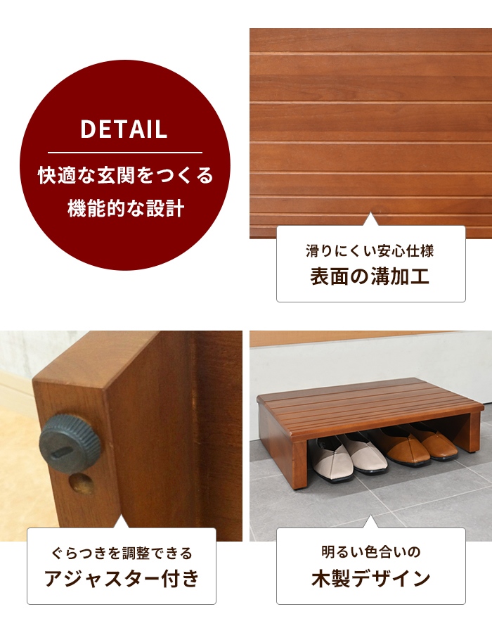| 玄関の段差を小さくし、昇り降りの負担をやわらげる玄関踏み台。 天然木の風合いが玄関を落ち着いた雰囲気に演出。 表面には溝加工を施し、滑りにくい安心設計。 踏み台下には靴を最大2足収納でき、玄関スペースを有効活用。 脚部にはガタつきを防ぐアジャスター付きで勾配のある玄関でも水平に設置できます。 コーナー部分に2台を組み合わせて使用するレイアウトも可能。 |