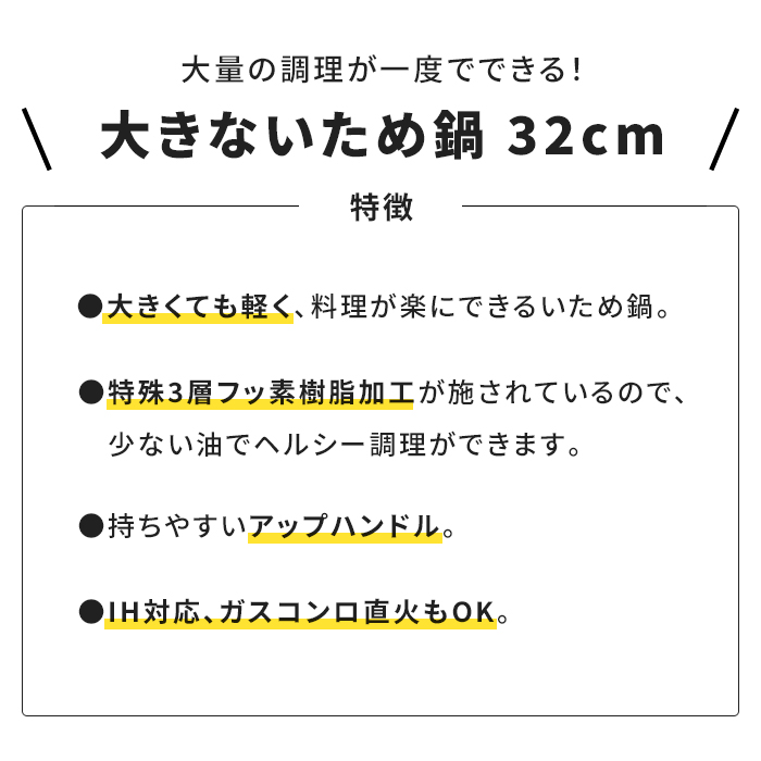| 大きくても軽く、料理が楽にできる炒め鍋。 強コーティングフッ素コート。 IH対応、ガスコンロ直火もOK。 |