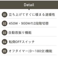 | □ 強弱切替:900W/450W □ 180分オフタイマー □ 自動首振り □ 首振り角度:自動首振り 70°、手動首振り 60° □ 転倒OFFスイッチ |