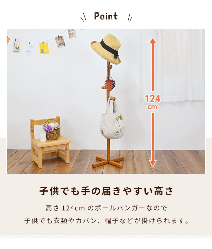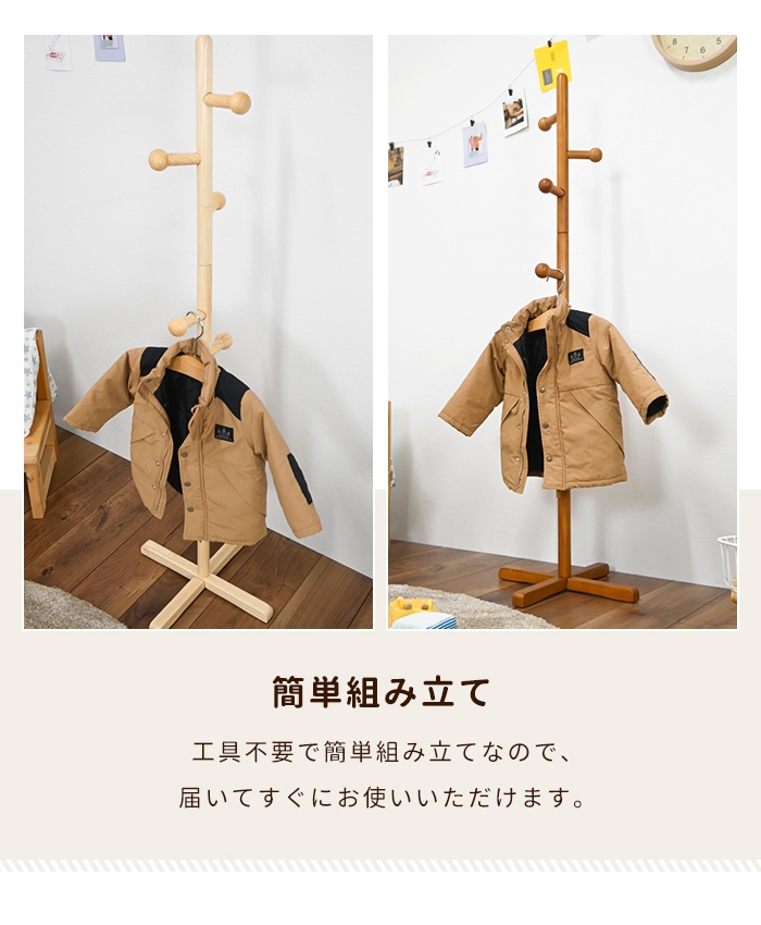 | ・天然木を使用したポールハンガー ・子どもでも使いやすい高さ設計 ・衣類やカバン、帽子などをサッと掛けて収納 ・移動しやすい軽量設計 ・省スペースで設置できるシンプル設計 ・工具不要の簡単組立 |