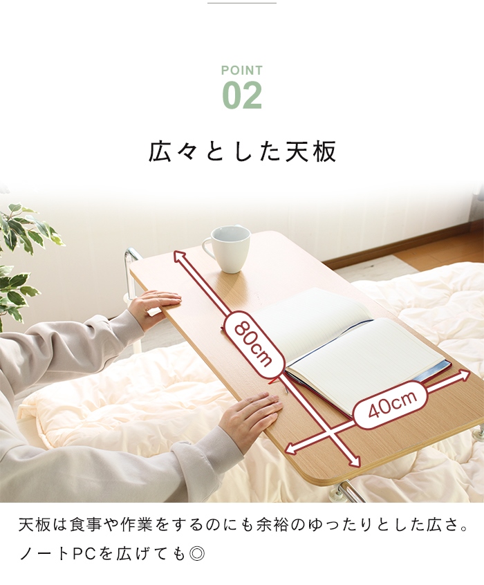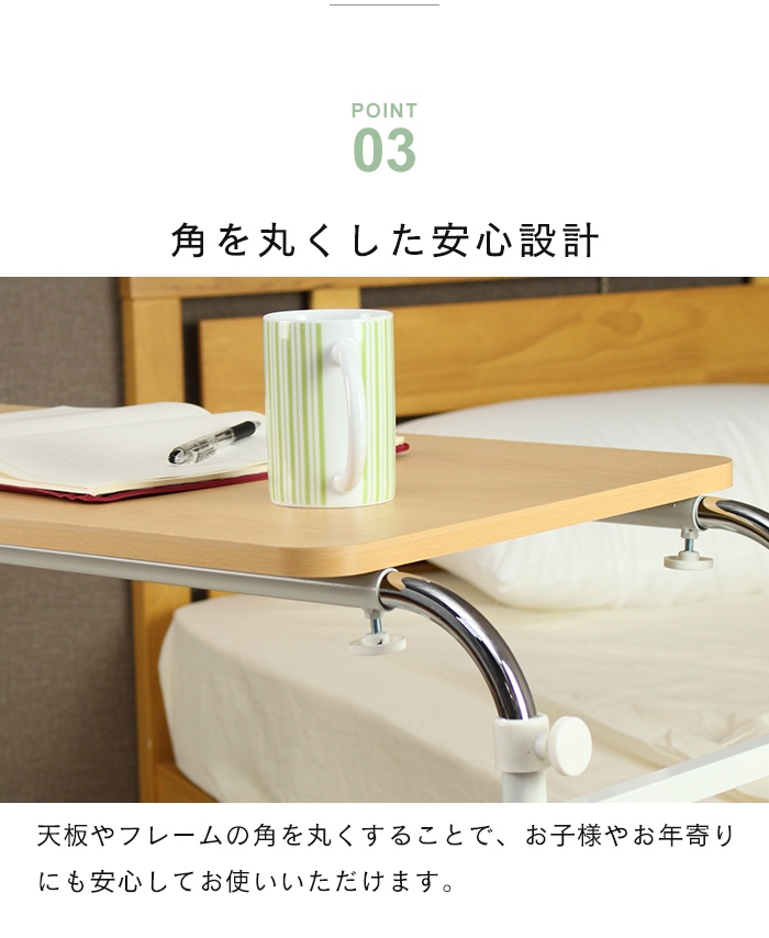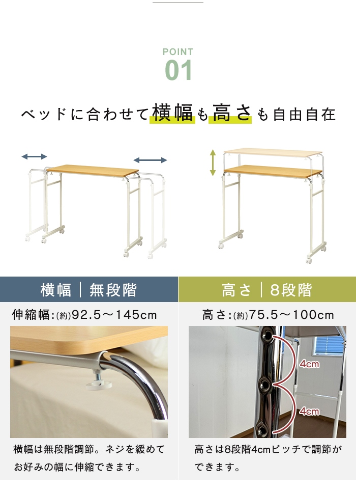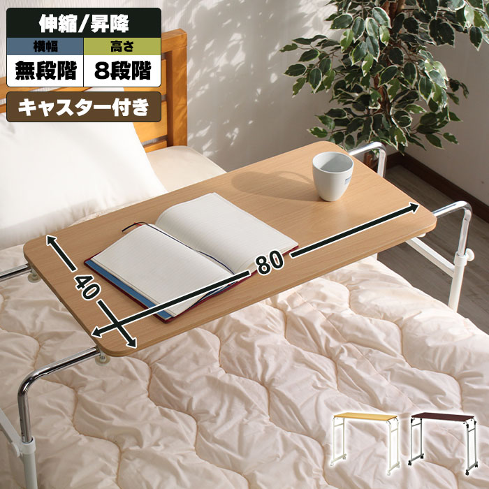 | ベッドサイズに合わせて横幅・高さを調節可能な伸縮ベッドテーブル。 シングルベッドからダブルベッドまでベッドに合わせて高さと横幅を変更できます。 キャスターが4つ付いているので、テーブル自体を自分で引き寄せることができます。 作業時や食事時など、テーブルを固定したい場合は、ロックをカチッとおろして固定することができます。 作業しやすい広々とした天板なので、病気や介護用のベッドテーブルとしてだけでなく、パソコンデスクとしても◎ |