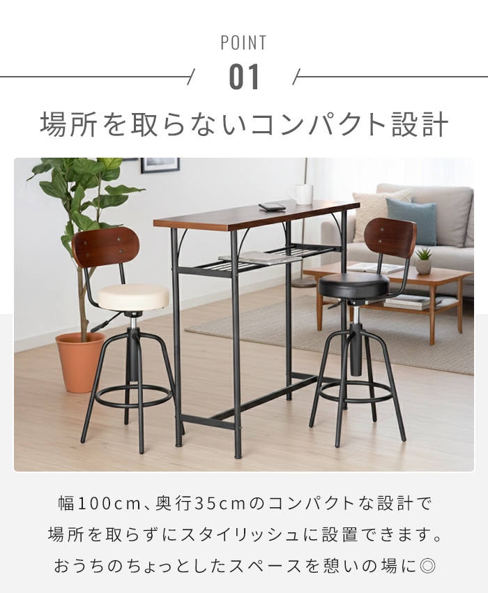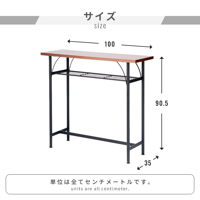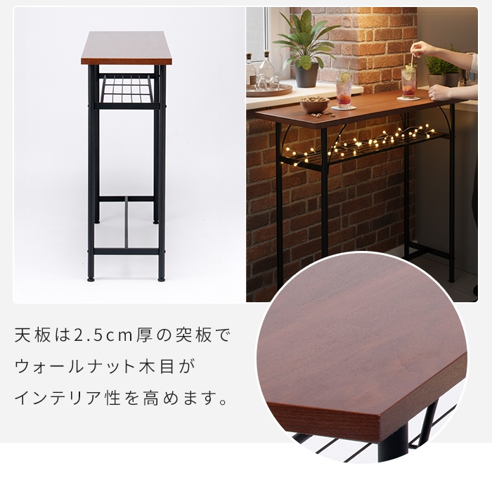 | おうちをカフェやバーのように演出できるカウンターテーブル。 幅100cm、奥行35cmのコンパクトな設計で場所を取らずにスタイリッシュに設置できます。 天板は2.5cm厚の突板でウォールナット木目がインテリア性を高めます。 雑誌やティッシュを置くのに便利な棚板は落下防止の鉄線付き。 中央下は揺れ補強兼足置きとして太パイプを通してあります。 足元はガタツキを微調整できるアジャスター付き。 |
