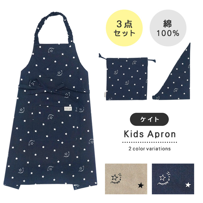 エプロン おしゃれ 子供 三角巾 セット ケイト 星 スター キッズ 女の子 男の子 ホルター バンダナ 巾着 130 140 150 プレゼント ギフト