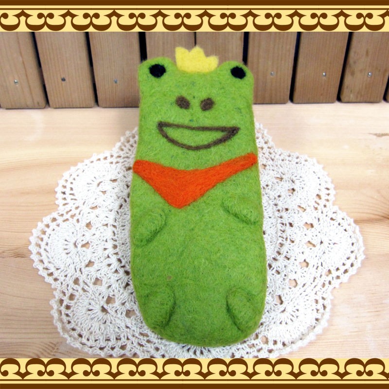 手作り感タップリ羊毛フェルト雑貨 カエルのロロフェルトペンケース コスメ道具入れにも