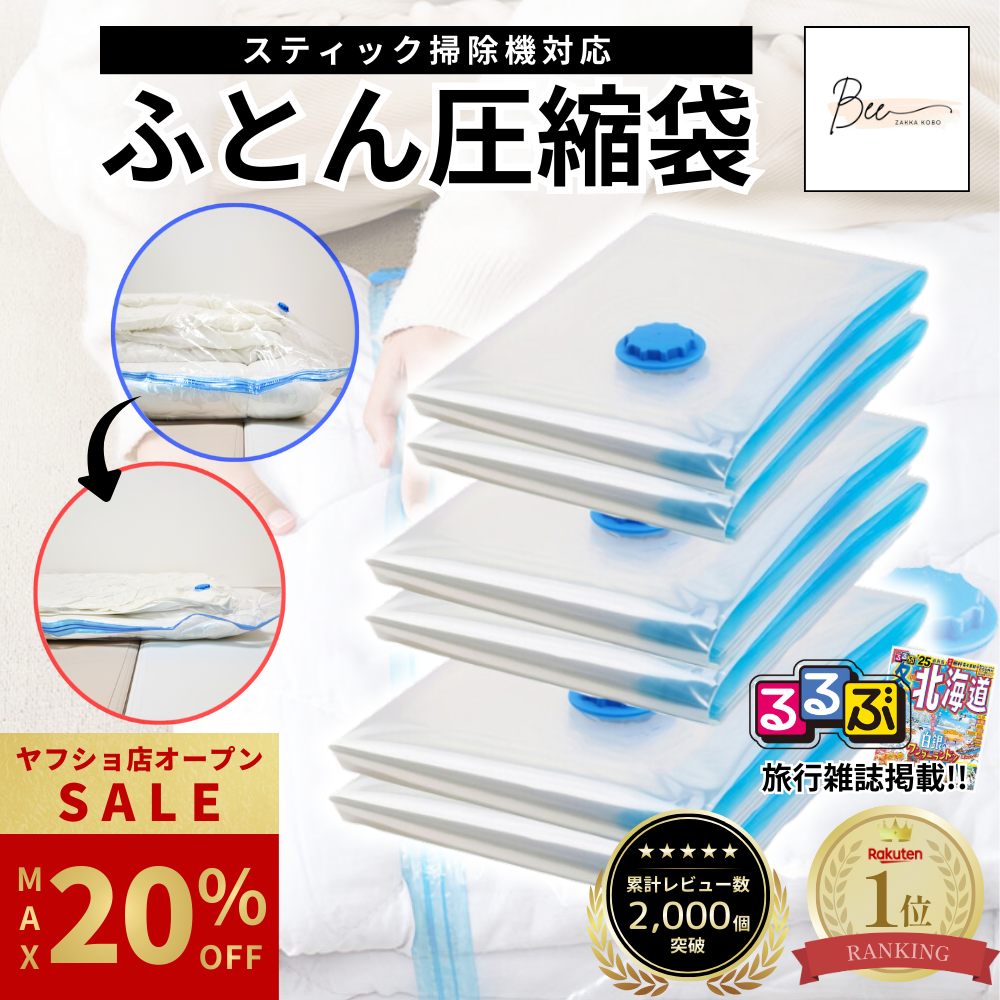 【商品仕様】ふとん一式、掛布団、敷布団、こたつ布団、敷パッド、毛布、バスタオル、衣類、洋服、ぬいぐるみなど様々なものを圧縮して収納できます。押し入れや棚の整理、衣替え、旅行、引っ越し、荷造りに最適な商品です。