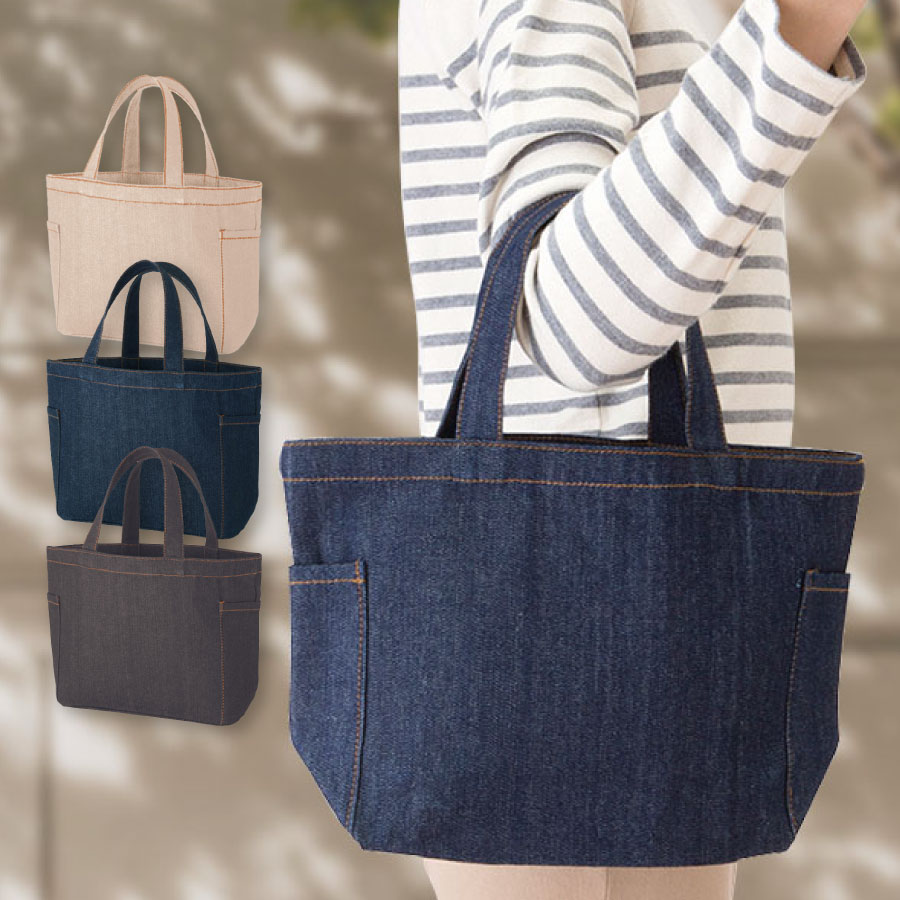 デニム風トートバッグ Sサイズ サイドポケット | お散歩 バッグ トート ショッピングバッグ エコバッグ