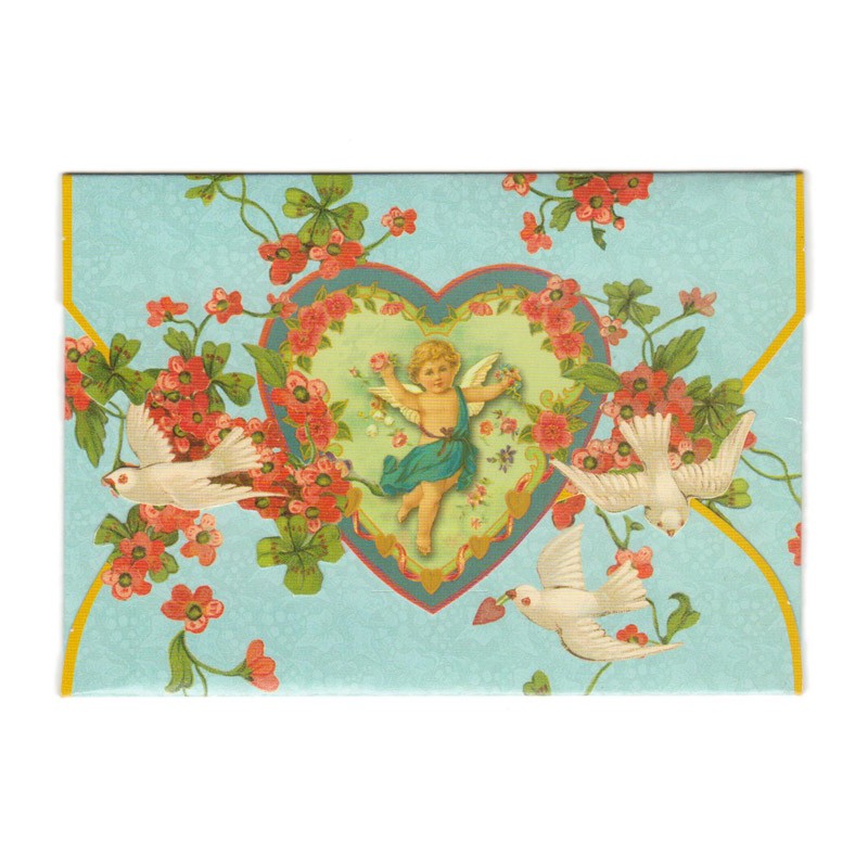 開き方が楽しいデザイン。ハートのフレームの中の天使と、飛び交う鳩たちのイラストがプリントされています。