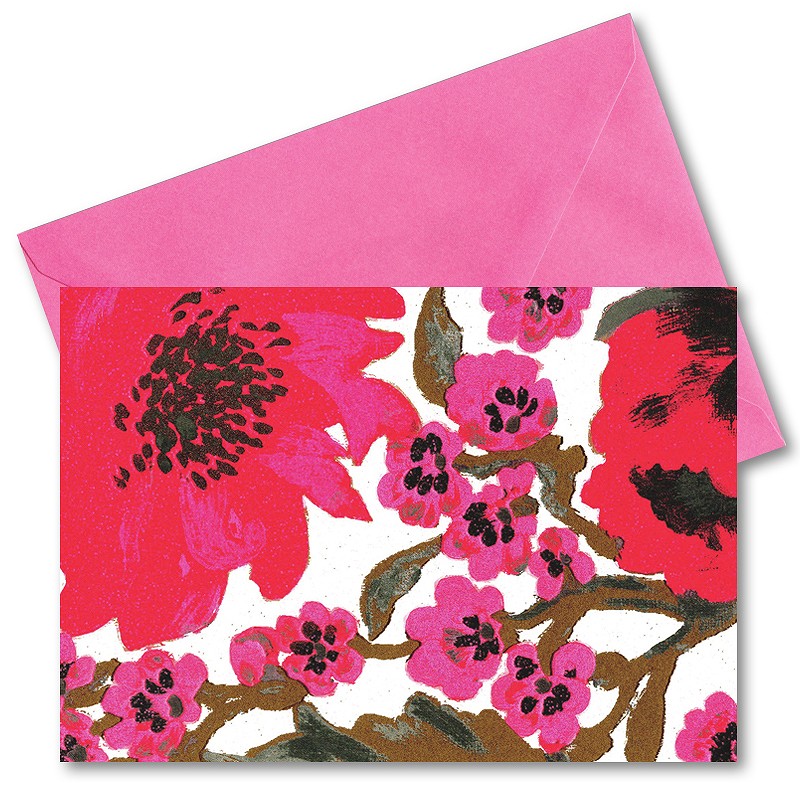 ロジャーラボード社から、内側に花柄のイラストがプリントされたピンク色の封筒とセットになった彩度の高いピンク色の花が特徴のグリーティングカードの登場です。