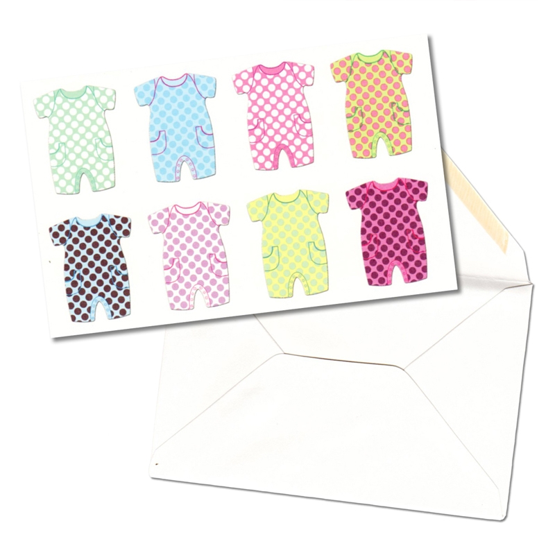 白色のカードには可愛らしいドット柄のカバーオールがたくさん描かれています。