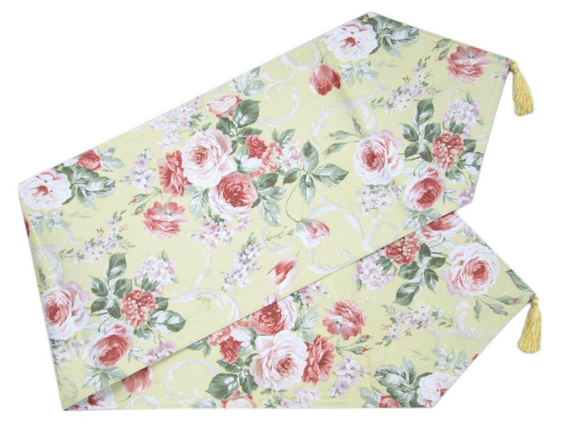 デザイン:テーブルランナー タッセル 花 ピンク 緑色 黄色