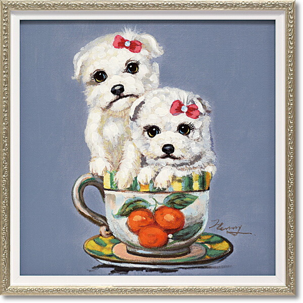 絵画 額入り オイルペイント 「ツー パピー イン カップ(Sサイズ))」 プレゼント インテリア おしゃれ 雑貨 壁掛け 油絵 アート ポスター