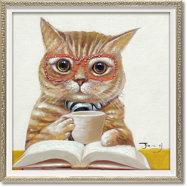 絵画 額入り オイルペイント 「カフェ キャット(Sサイズ)」 プレゼント インテリア おしゃれ 雑貨 壁掛け 油絵 アート ポスター