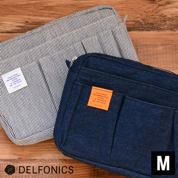 【インナーキャリング デニム M】 バッグインバッグとしての収納力の高さと、ワーク感のあるシンプルなデザインが人気のDELFONICS(デルフォニックス)のインナーキャリング。今回、ナスカン金具などを取り付けられるタブが2つ付くデザインに変更され、別売りのストラップを付けると、ショルダーバッグとしてもお使いいただけるようになりました。インナーキャリングは、バッグの中で散らかりがちな小物をまとめて収納できるバッグインバッグ。携帯電話や財布や鍵などの必需品はもちろん、ポータブル機器、定期入れ、メモ帳、眼鏡、筆記用具、コスメなどの小物類をひとまとめにしてバッグの中身をすっきり整理できます。丈夫な帆布製なので、シャーペンなど尖った筆記具を入れても、中身を多少ぎっしり詰め込んでも安心です。 表・裏・内側に様々なサイズのポケットがついているので、ポケットサイズに合わせて入れる物の定位置を決めておけば、取り出したいものがすぐに取り出せないイライラからも解消!毎日のお出かけの必需品をこのインナーキャリングにセットしておけば、面倒なバッグの移し替えが、移し忘れもなく一瞬で終わります。インナーキャリングをまるごと移動させるだけなので楽チンですよね♪ インナーキャリングは、バッグインバッグ・インナーバッグとしてはもちろん、化粧ポーチやトラベルポーチとしても使えるマルチポーチ。さらに、別売りのショルダーストラップをつければショルダーバッグに大変身!何かと準備が大変で、出かける場所や移動手段によってバッグを変えたり、貴重品だけ持って移動するシーンが多い、赤ちゃんとのお出かけも、きっともっと楽になります。 こちらのMサイズは、A5サイズの手帳やノートがすっぽり入るスタンダードサイズです。ホワイト(ヒッコリーストライプ柄)とダークブルー(デニム柄)の2色展開。 |