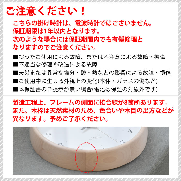 | ※天然木を使用しているため、色味や木の模様に個体差が生じます。 ※製造工程上、フレームの側面に接合線があります。 ※こちらの掛け時計は、電波時計ではございません。 |