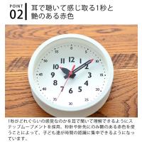 ホワイトのフレームでシンプルなデザインですが、秒針や針の先など時計を読む上で重要なポイントにのみ「艶のある赤」を用いることによって、時計を見る子ども達が時刻を認識することに集中できるようになっています。