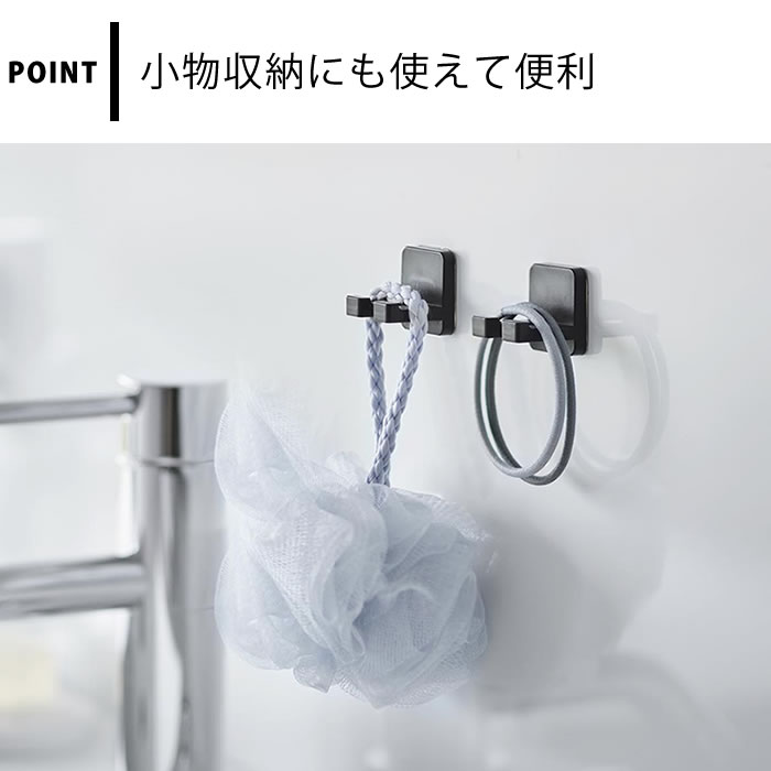 | 【使用できる面】 光沢のある平らな油染みしない面で、フィルムフックの接着面よりも大きい面・タイル・プラスチック・ステンレス・ガラス・鏡面(ミラー)・金属塗装面・人工大理石 ※表面加工・材質・状態などによっては貼り付けできない場合があります。 ※耐荷重・フィルムフックの接着力は設置面の材質・強度・表面の状態・環境等によって異なります。 ※直接水がかかる場所では、フィルムフックの粘着力が弱くなる場合があります。 ※サイズや形状によっては収納できない物もあります。 |