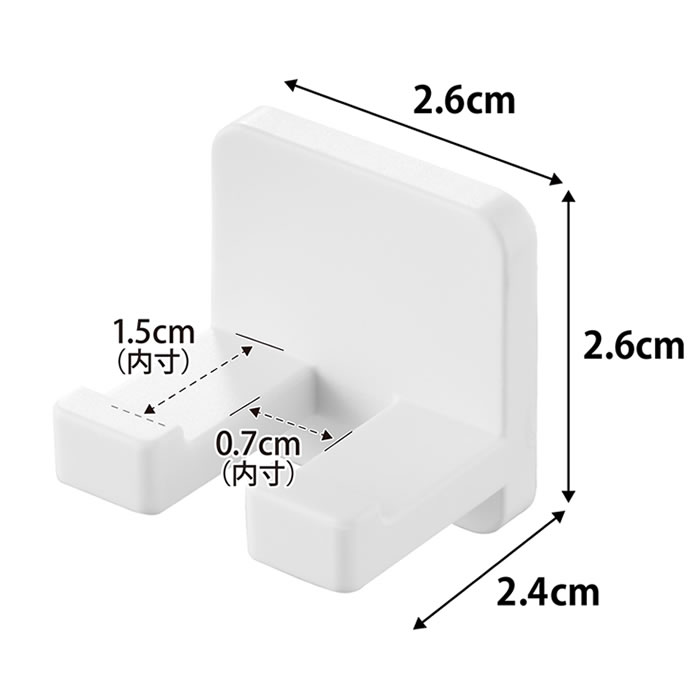 | サイズ 約 W2.6×D2.4×H2.6cm(1つあたり・フィルムフック含まず) フィルムフック接着面:約 W2.5×H2.6cm(1つあたり) ホルダー収納部:約 W0.7×D1.5cm |