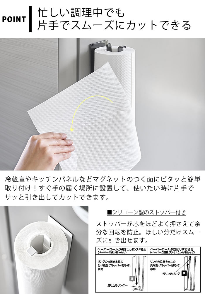 片手でカットマグネットキッチンペーパーホルダー タワー 縦タイプ ![]() 片手でサッと簡単に切れる 冷蔵庫やキッチンパネルなどにマグネットで簡単取り付け!片手でカットできるキッチンペーパーホルダーです。縦向き、横向きのどちらでも使用可能。差し込むだけのシンプルな構造で使いやすく便利です。シリコーン製のストッパーがキッチンペーパーロールをしっかりキャッチし、スムーズにカットできて作業を効率化できます。キッチンパネルに設置すれば、野菜の水切りや台拭き、油汚れなどの拭き掃除の際にも便利です。 ![]() ![]() ![]() ![]() ![]() ![]() ![]() ![]() |