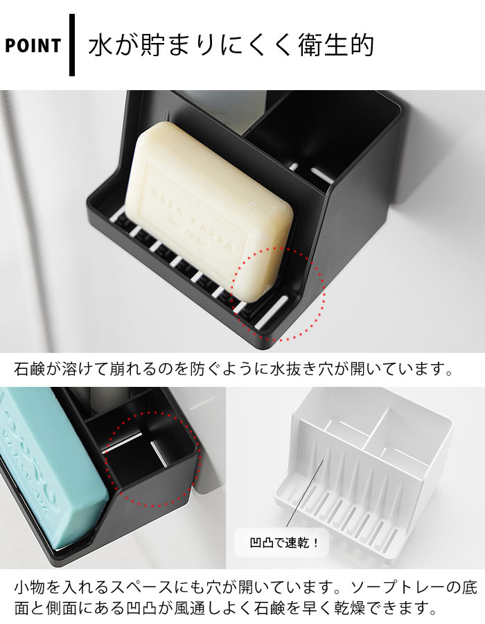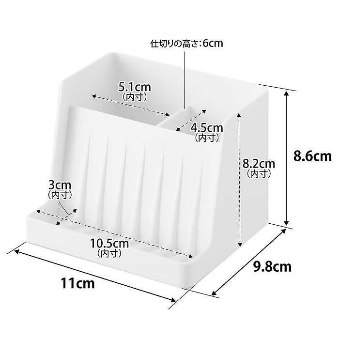 | サイズ 外寸:約 W11×D9.8×H8.6cm ソープトレー部:約 W10.5×D3cm 収納部1つあたり:約 W5.1×D4.5×H8.2cm 仕切り:約 H6cm |