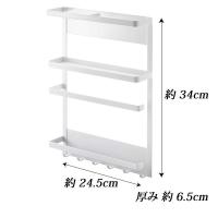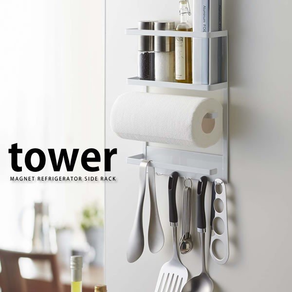 【マグネット冷蔵庫サイドラック タワー】冷蔵庫側面に磁石で簡単取り付け。よく使うキッチン小物を一括収納。上段には、よく使うラップやアルミホイルを立てて入れることができます。中断には、キッチンペーパーや布巾を掛けられるホルダー付き。下段にはフックが付いているので、鍋つかみ、栓抜き、缶切りなどを吊るして収納できます。台所のインテリアに合わせてホワイト、ブラックからお選び下さい。