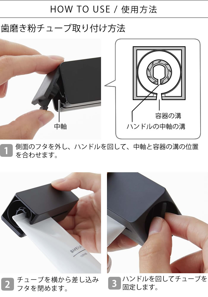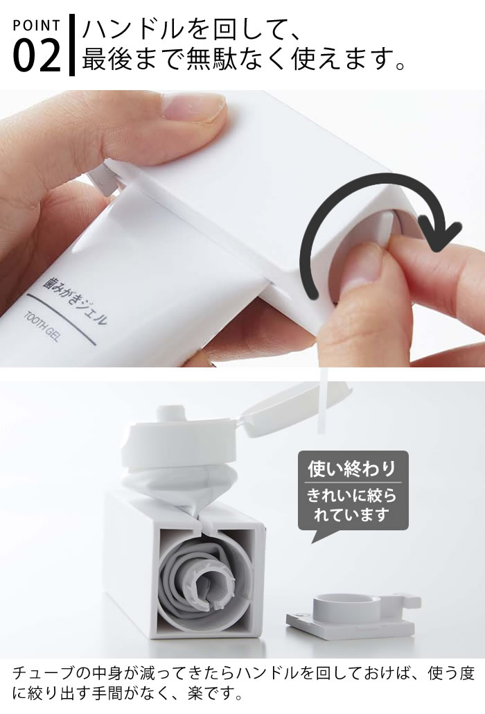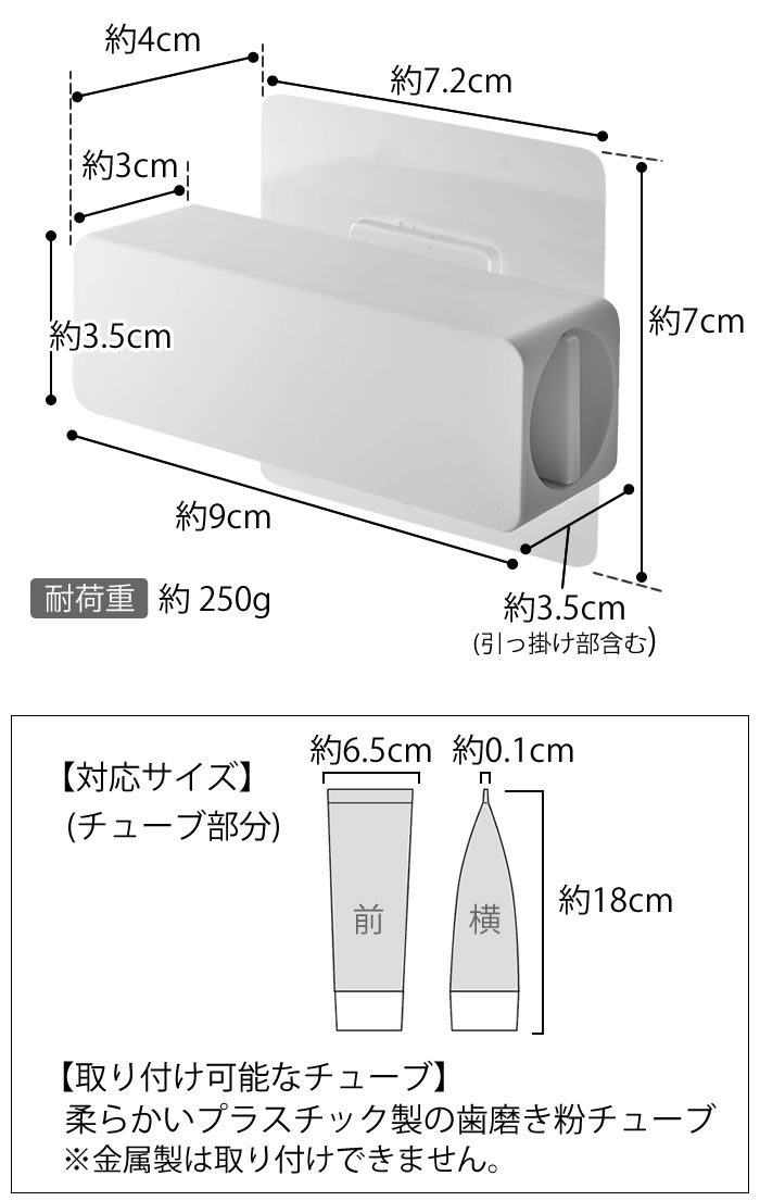 | 対応チューブ ■サイズ:幅約6.5cm・厚み約0.1cm・長さ約18cm以内を目安にしています。 ■柔らかいプラスチック製の歯磨き粉チューブが取り付け可能です。 ※金属製の歯磨き粉チューブには対応していません。 |