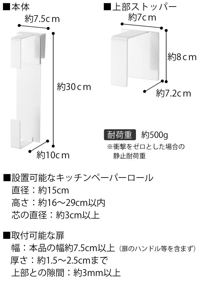| 使用可能な扉 幅:本品の幅約7.5cm以上(扉のハンドル等を含まず) 厚さ:約1.5〜2.5cmまで 上部との隙間:約3mm以上 |