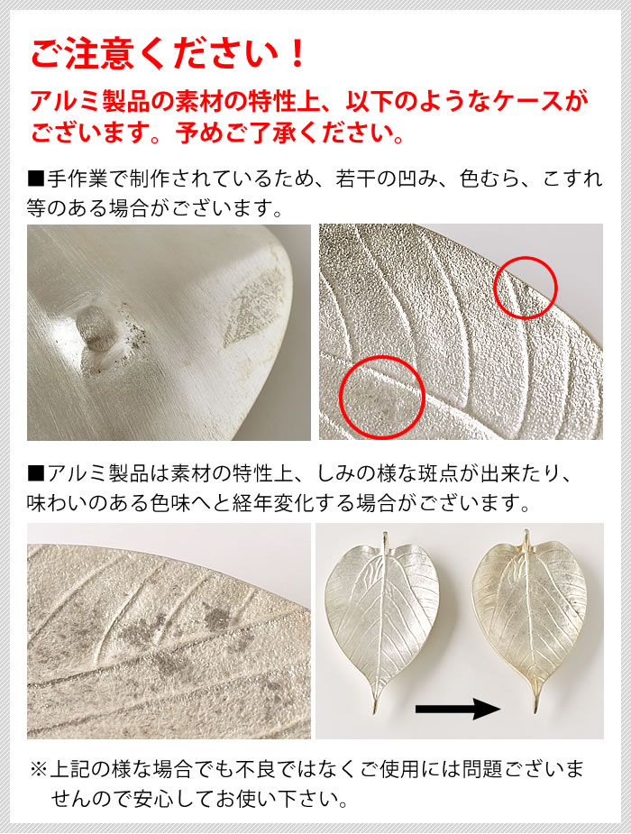 | ※アルミ製品は素材の特性上、しみの様な斑点が出来たり、味わいのある色味へと経年変化する場合がございますが、予めご了承ください。 ※手作業で制作されているため、若干の凹み、色むら、こすれ等のある場合がございますが、予めご了承ください。 |