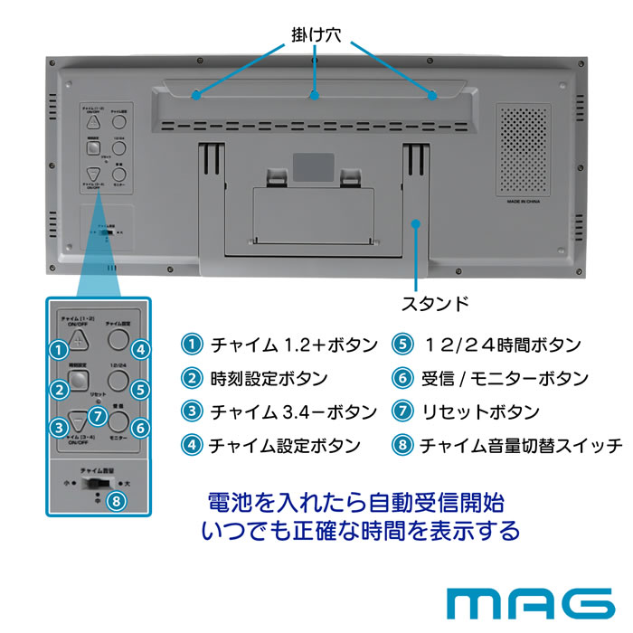 | 仕様 保証期間:お買い上げ日より1年間 単3形アルカリ乾電池6本(別売)使用 電子音アラーム カレンダー表示 温度/湿度表示 置掛兼用 12/24時間表示切替 電池交換お知らせ表示 プログラムチャイム(4回) |