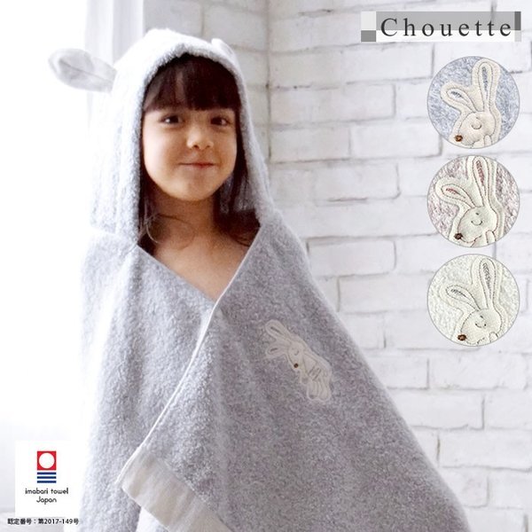 大切なお子様へ最初のプレゼント。そんなギフトにぴったりな綿100%のフード付きバスタオルです。生産地は、国内最大のタオルの産地、今治。豊かな自然に恵まれたこの地で、厳選された素材で、安心・安全な今治のタオルをお届けします。シュエットは、今治ブランド認定商品です。「ママから大切なお子様へ…大切な贈り物」をコンセプトに作られたママズセレクトの「シュエット」シリーズは、落ち着いたパステルの色味に、無撚糸(撚りの無い糸)を使用したパイル生地を使用したボリューム感たっぷりのふわふわな使い心地です。うさぎのアップリケ部分にはニット地を使用し、細部までやわらかさにこだわって作られています。また、時間をかけて丁寧に洗っているので柔らかく吸収性の良い仕上がりになっています。お洗濯後の、ふんわり感はとても肌触りがよく、デリケートな赤ちゃんの肌を優しく包み込んでくれます。又、綿100%なので、衛生面においても安心してお使いいただけます。目を惹く大きなウサギのアップリケは、使う度赤ちゃんも育児に大変なお母さんも思わずにっこり癒されます。ふんわりふかふかの優しい肌触りは、産まれたての赤ちゃんにも使えます。もちろんバスタオルだけでなく、おくるみとしてもお使いいただけます。大きくなったら、プールのタオルとしてもおススメです。新生児から幼児まで長くお使いいただける逸品です。ご出産祝いの贈り物として、必ず喜ばれる「特別な」1枚です。