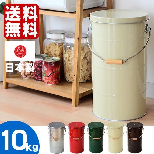 【オバケツ ライスストッカー 10kg】 歴史ある日本のバケツメーカーが作る米びつ缶。見た目は米びつにはとても見えない、おしゃれでシンプルなドラム型の缶。どこかの海外製の缶にも見える、この米びつ缶の正体は、実は大正12年創業の歴史ある日本の小さな町工場から生まれたもの。 創業当時から『一生使えるバケツづくり』をコンセプトに、サビに強く、壊れにくいバケツを研究し作り続け、小さな部品にも妥協することなく、全て厳選した最高の日本製素材を使用。そんな日本の職人達が作りだした、このOBAKETSUライスストッカーは、『毎日食べるお米をおしゃれに使いやすく保存したい』という声から生まれました。 素材のトタン材は光を通さないため、お米の乾燥を防ぎ、防虫にも優れています。また、温度・湿度を適度にキープするため、お米の美味しさを保ちます。フタは二重構造で、中の空気が密封されて外気に触れにくいため、お米の鮮度を維持。お米を取り出しやすく、汚れても水洗いしやすい丸型デザインで清潔に保管できます。 また、お米の保存だけでなく、お菓子やパスタなどの乾物の保存容器として、犬や猫などのペットフードの保存容器としてもおすすめ。 兵庫県姫路市にある工場で、今もひとつひとつ熟練職人による手作業によって丁寧に仕上げられている『OBAKETSUライスストッカー』。職人の手作業の為、1日に製造出来る数は限られており、在庫確保に時間がかかる場合もございますが、確実に安心できる品質とこだわりをお客様のもとへお届けいたします。 |