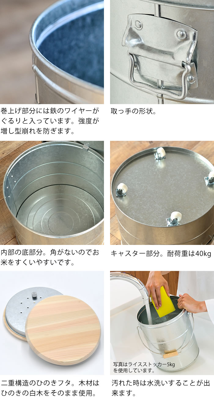 | 仕様 ・光を通さず、外気の影響も受けにくい ・お米を乾燥から守る ・フタ部分は二重構造(天然木の白木を使用) |