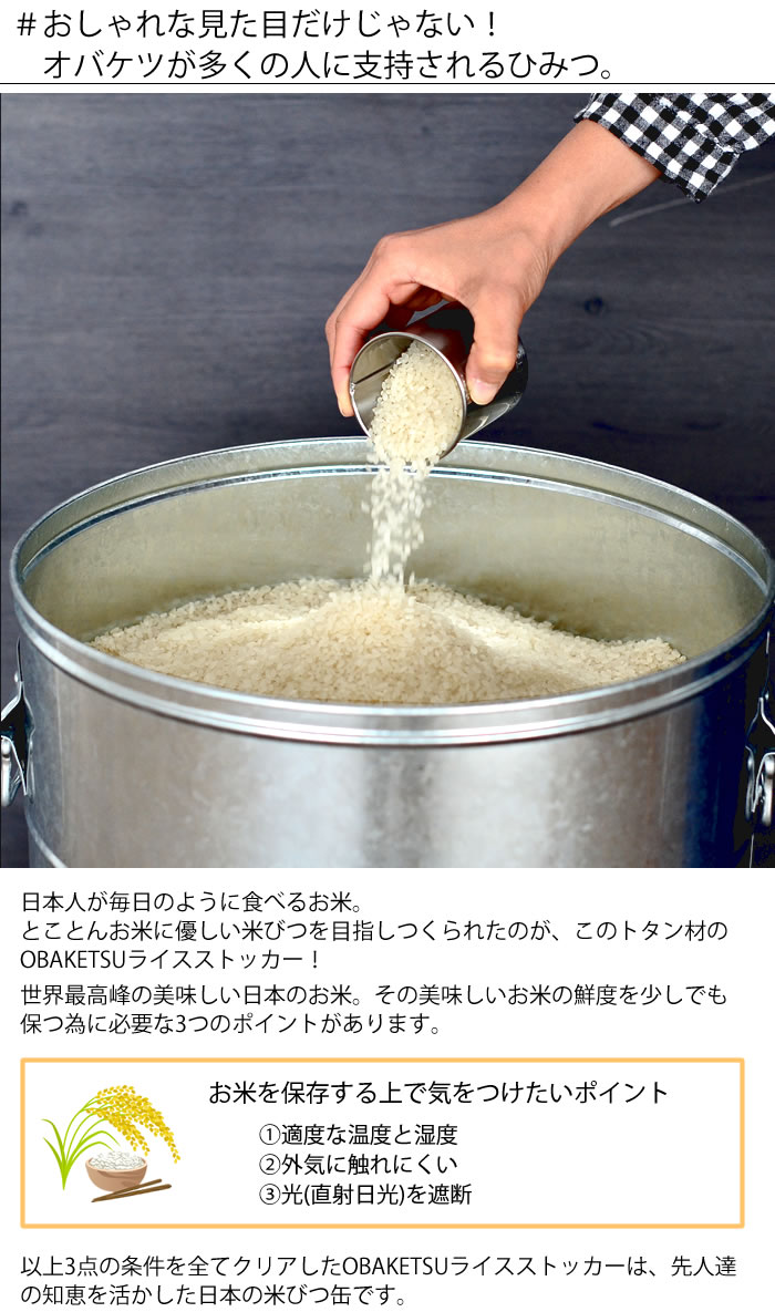 オバケツ ライスストッカー 30kg キャスター付き ひのきフタ ![]() 移動もらくらく♪ オバケツは1923年(大正十二年)にトタンバケツ専門メーカーとして姫路城の城下町で創業しました。バケツ一筋の職人が『毎日食べるお米をおしゃれに使いやすく保存したい』という声を受け、細部にまでこだわり生み出した一品です。蓋は国産の高級感あふれる「ひのきの白木」をそのまま使用。耐久性・防湿効果・抗菌作用・保湿効果にも優れています。兵庫県姫路市にある工場で、今もひとつひとつ熟練職人による手作業によって、バケツ素材から針金、小さなネジまですべて日本製にこだわり丁寧に仕上げられています。職人の手作業の為、1日に製造出来る数は限られており、在庫確保に時間がかかる場合もございますが、確実に安心できる品質とこだわりをお客様のもとへお届けいたします。 ![]() ![]() ![]() ![]() ![]() ![]() ![]() ![]() ![]() ![]() ![]() ![]() ![]() ![]() ![]() |