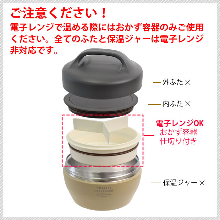 | 素材 保温ジャー内側:ステンレス鋼 保温ジャー外側:ステンレス鋼(ポリエステル粉体塗装) ふた:ポリプロピレン おかず容器・仕切り:ポリプロピレン おかず容器ふた:ポリプロピレン(スチレンフォーム内蔵) パッキン:シリコーンゴム |