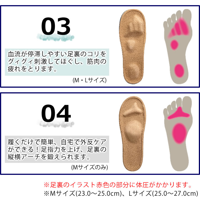 | ※最初は様子を見ながら徐々に慣らしてください。 ※痛みを感じる場合は、短い間隔からご使用ください。 ※痛みや違和感などが改善されない場合は、ただちにご使用を中止してください。 ※足などに痛みや疾患をお持ちの方は医師にご相談ください。 ※本品は室内履きスリッパです。 ※治療を目的とはしておりません。 ※妊娠中や階段の昇り降り、荷物をお持ちの際は十分にご注意ください。 ※一時間以上連続でのご使用はお控えください。(2時間以上あけて再度ご使用ください。) ※使用時に走ったり、飛び上がったりしないでください。 ※本品は洗えません。汚れた場合は、よく絞った濡れタオルで汚れを拭き取り、日陰干ししてください。 ※ご使用によりアッパーにシワが生じることがありますが、品質、機能に問題はございません。 ※濡れた状態での使用は摩擦により色移りすることがあります。ご注意ください。 |