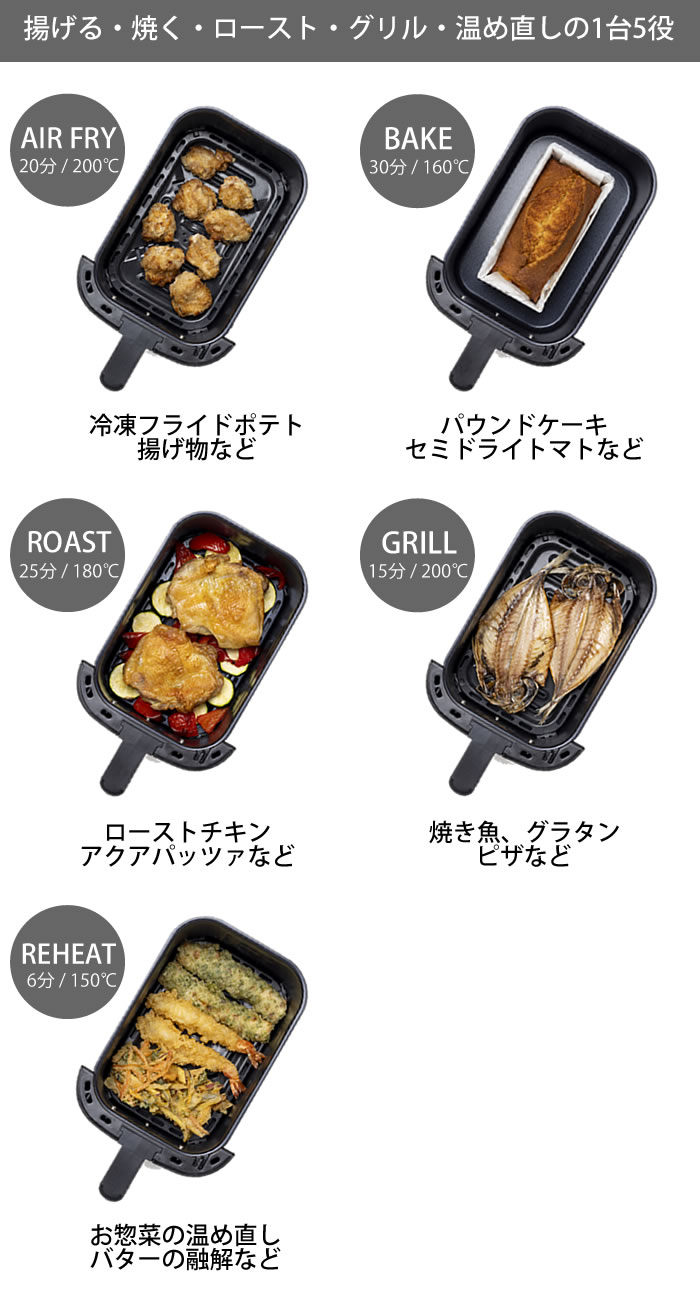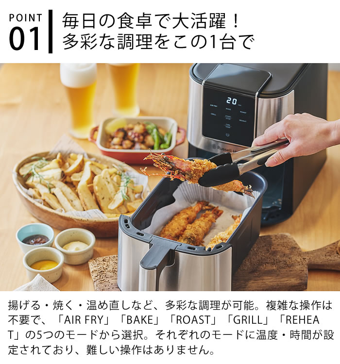 Russell Hobbs ラッセルホブス エアフライオーブン 1420JP ![]() 時短・ヘルシー・片付け簡単 揚げる・焼く・温め直しなど、多彩な調理が可能な多機能エアフライヤー。「AIR FRY」「BAKE」「ROAST」「GRILL」「REHEAT」の5つのモードから選択。それぞれのモードに温度・時間が設定されているので、難しい操作は必要ありません。また、お好みに合わせて、温度・時間の設定も可能です。※60〜200℃の間で5℃単位、※1〜60分の間で1分刻み。幅21cmのスリムなデザインは、狭いキッチンにもすっきり収まります。最大容量3Lの広々庫内で、魚の開きや複数品目の同時調理もラクラク。バスケットやトレイは取り外し可能で食洗機対応。別売のペーパーライナーを使えば、後片付けも簡単です。毎日の料理をもっと手軽に、もっと楽しく。 ![]() ![]() ![]() ![]() ![]() ![]() ![]() ![]() ![]() ![]() ![]() ![]() ![]() |