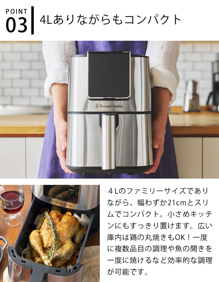 | Russell Hobbs ラッセルホブス エアフライオーブン 1420JP エアフライヤー ノンフライオーブン 多機能 スリム 温度調整 食洗機対応 4リットル タッチパネル式 揚げる 焼く 温め直し |