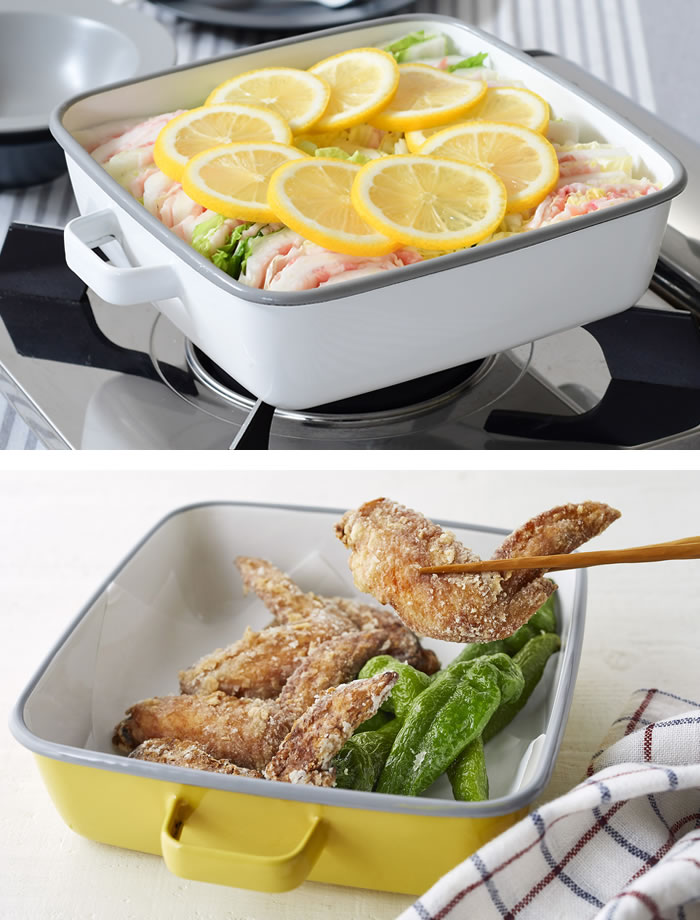 | 素材 本体:ほうろう用鋼板 縁:熱可塑性エラストマー (耐熱温度/100度、耐冷温度/-20度) フタ:ポリプロピレン (耐熱温度/120度、耐冷温度/-20度) |