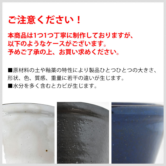| ※陶器製ですので、落としたり衝撃を与えたりすると破損する恐れがありますのでご注意ください。 ※原材料の土や釉薬の特性により製品ひとつひとつの大きさ、形状、色、質感、重量に若干の違いが生じます。 ※洗浄後は十分に乾かしてから収納してください。カビ等の原因になります。 ※直火ではご使用いただけません。 |