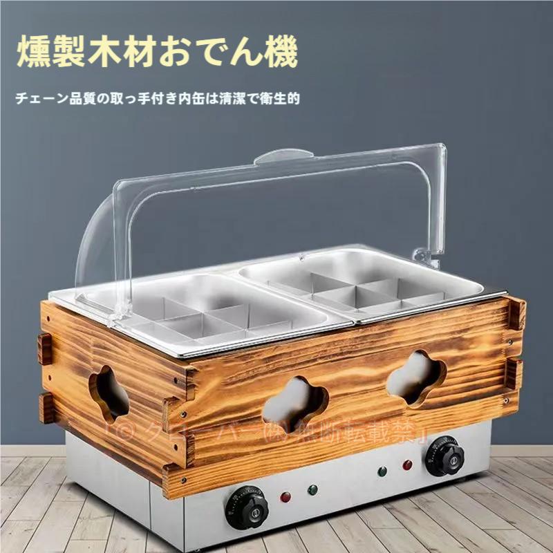 おでん鍋は大容量なので、大人数の前での調理にも最適です。鋳造アルミニウム加熱プレートは、通常の加熱チューブよりも均一で高速、かつ長持ちします。外装は炭化木で、ステンレス製の内釜が純粋な味わいを引き立てます。防塵カバーが付属しており、効果的に温度を保つことができます。