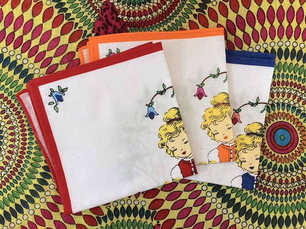 小さなハンカチ 金髪の少女 ヒヨコ お花 幼稚園児 小学生 コットン 綿 26cm 紺 オレンジ 赤 少女の夢 昭和感 レトロテイスト
