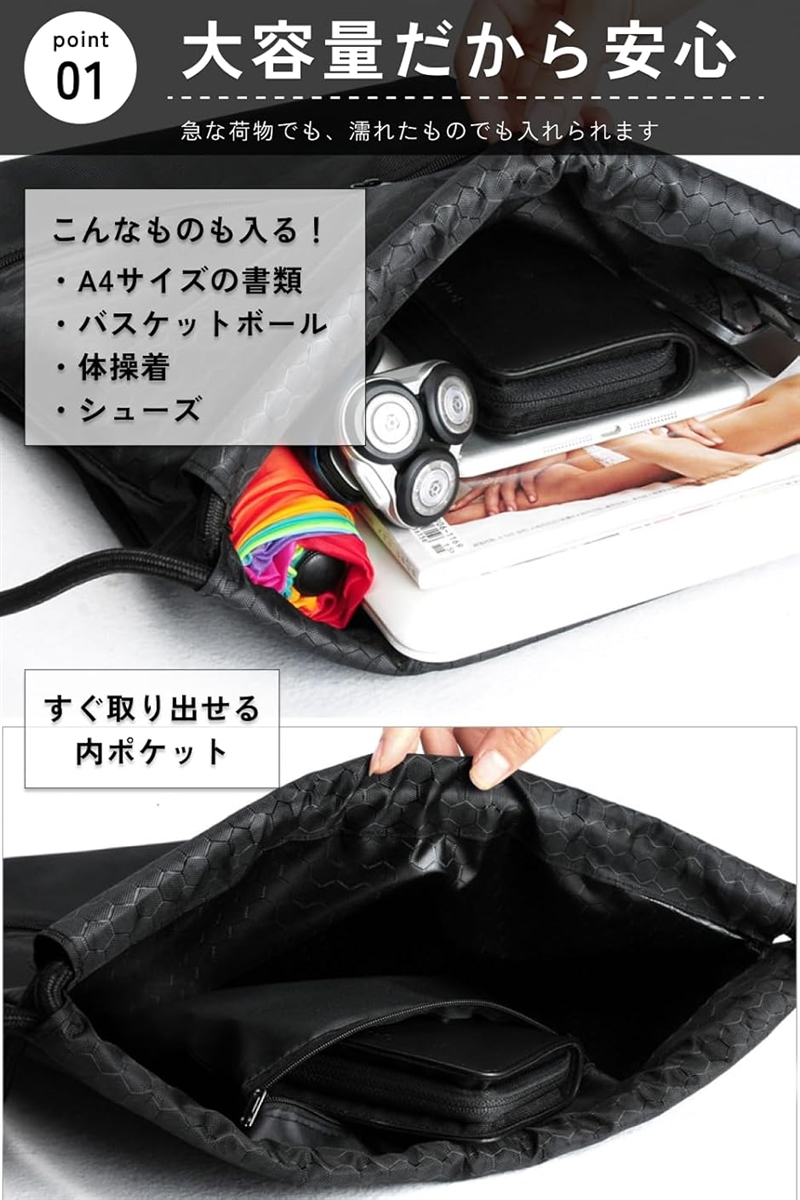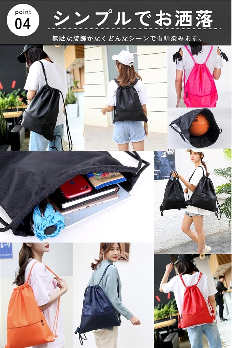 このナップサックは、軽量でありながら頑丈な素材を使用しており、大量の荷物を楽々収納できます。