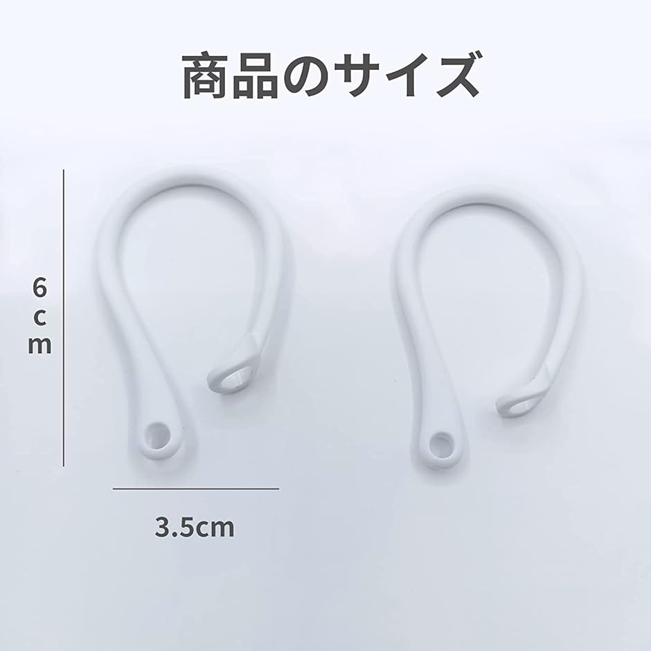 「製品仕様」 対応機種 :全てのAirPodsに対応;* 内容物 : イヤーフック 左右x1個 * サイズ : 約 6cm x 3.5cm x 0.9cm *重量 : 約 3g * 素材 : TPU