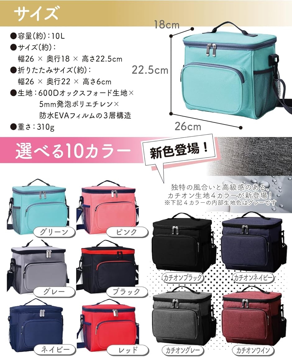 「商品規格」 容量(約):10L サイズ(約):幅26 x 奥行18 x 高さ22.5cm 折りたたみサイズ(約):幅26 x 奥行22 x 高さ6cm 生地:600Dオックスフォード生地x5mm発泡ポリエチレンx防水EVAフィルムの3層構造 重さ:310g