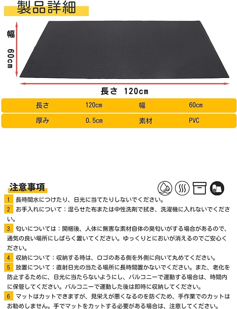 材質:PVC(ポリ塩化ビニル樹脂)本体サイズ:幅60x奥行120x厚さ0.5cm重量:約1.15kgカラー:ブラック製品の役割:床の保護、スポーツ音の低減、クッション効果、振動の吸収、機械の滑り止め、機器の長寿命化製品のメリット (1)両面ノンスリップ加工 (2) 丈夫で耐久性がある (3) 耐水性、耐汗性 (4) 高い復元力 (5) 簡単な収納